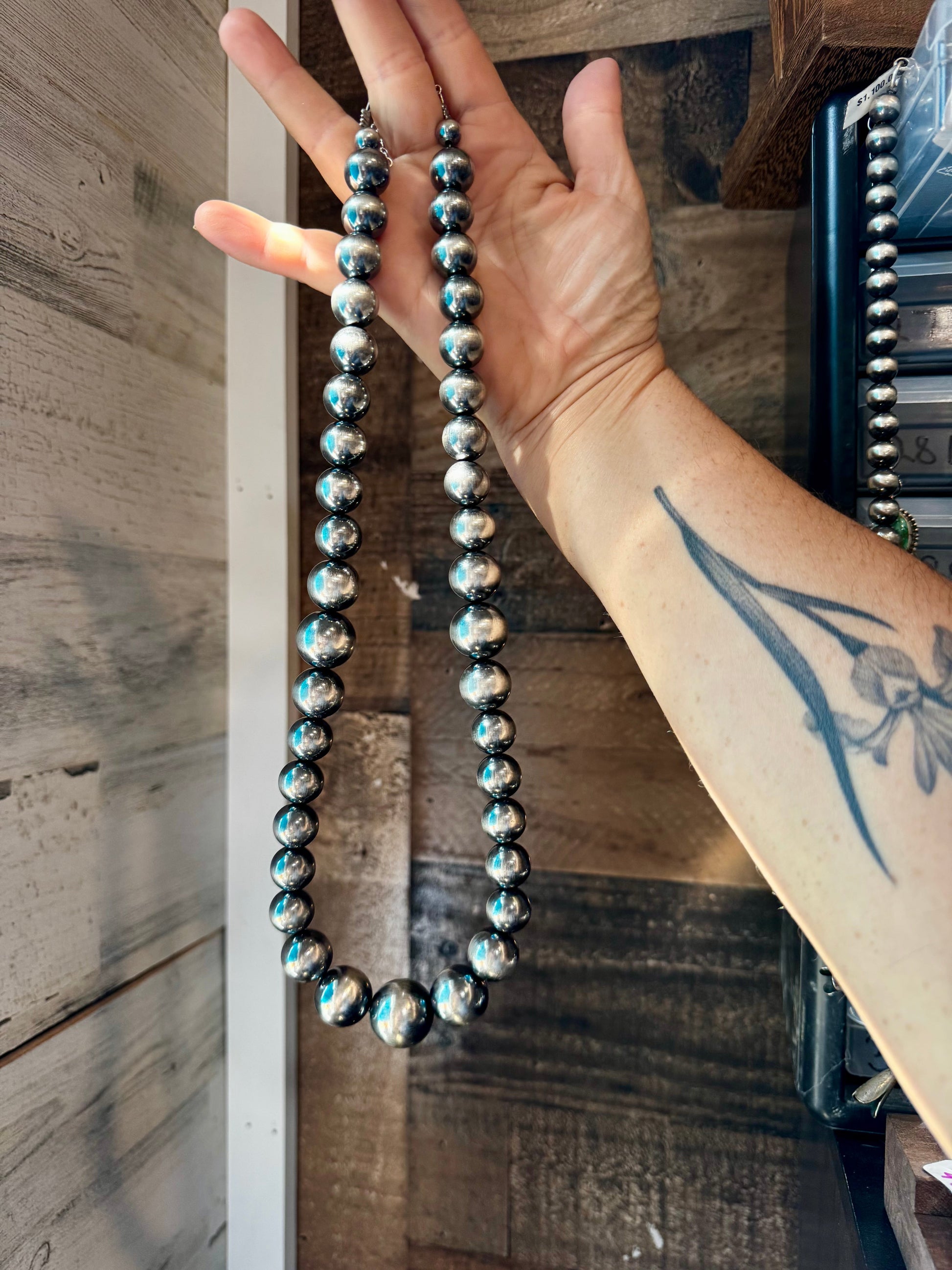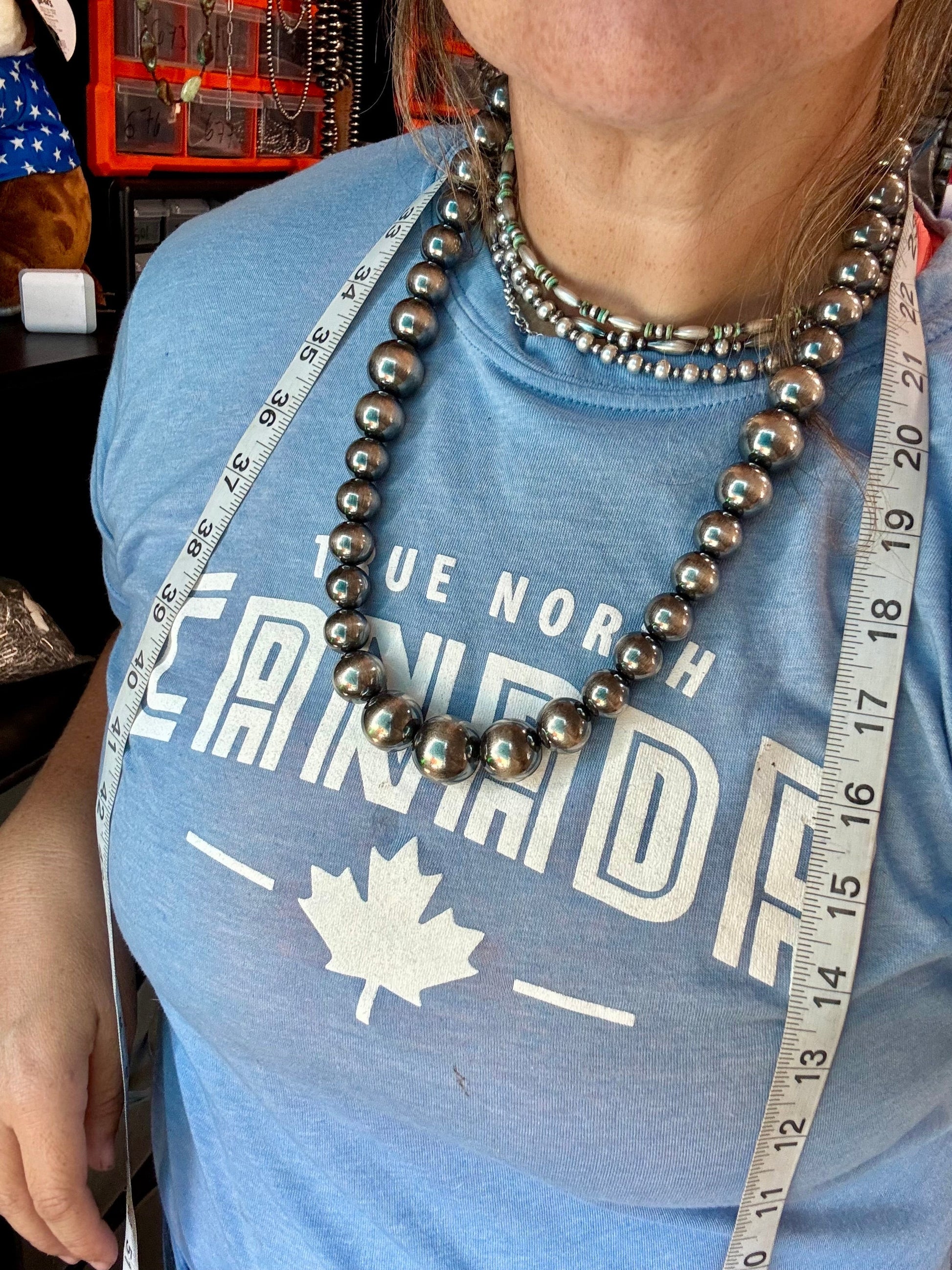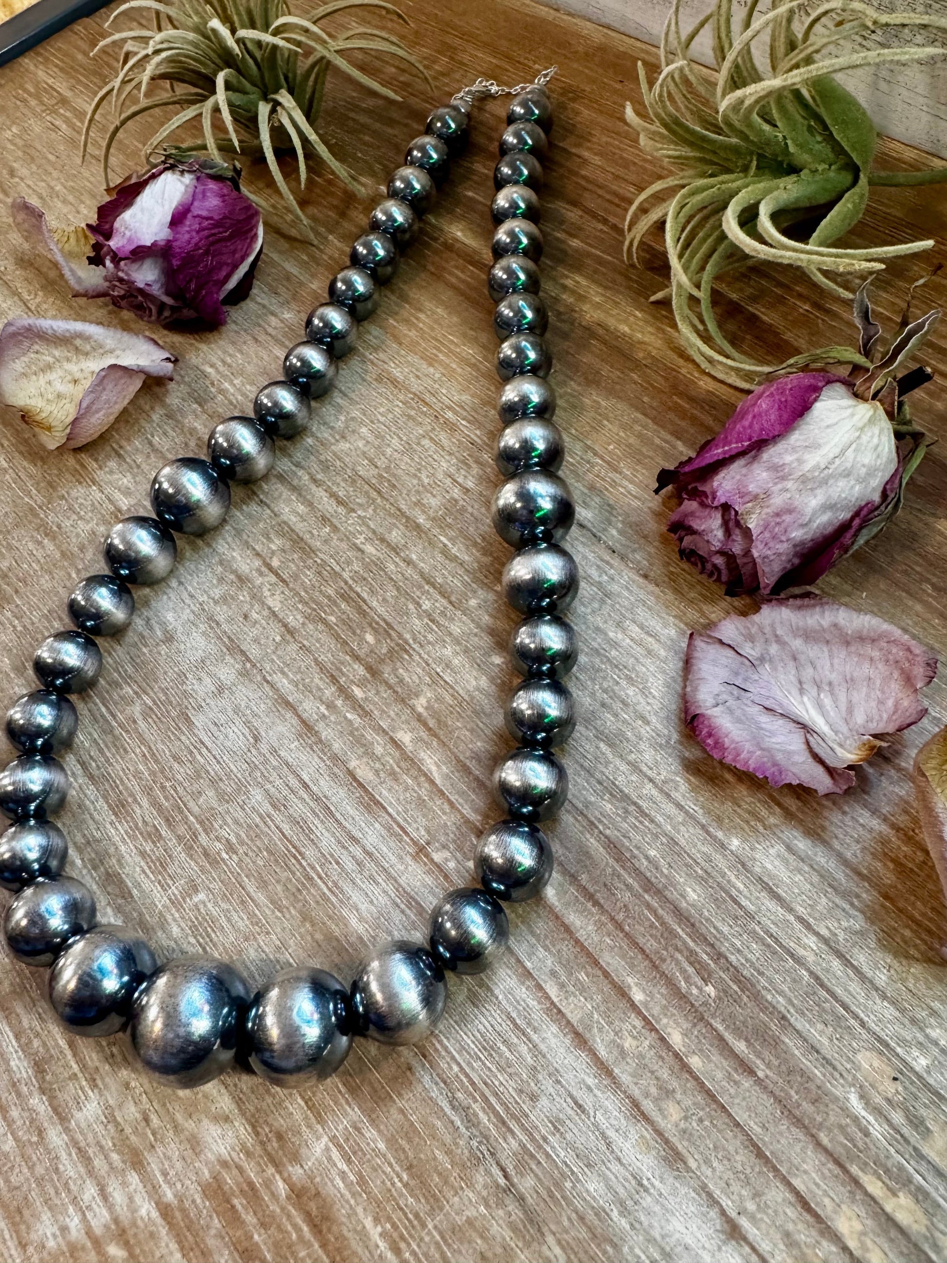 Handmade in the USA by The Bijoux FAB, this is our boldest sterling silver pearl necklace yet. It begins with elegant 8mm pearls near the clasp and graduates into 14mm, 16mm, 18mm, and 20mm sterling silver pearls for a dramatic, luxurious look. Measuring 24 inches long plus extender, this statement piece brings timeless Western style and handcrafted beauty together. Each bead is solid and polished for a brilliant finish.